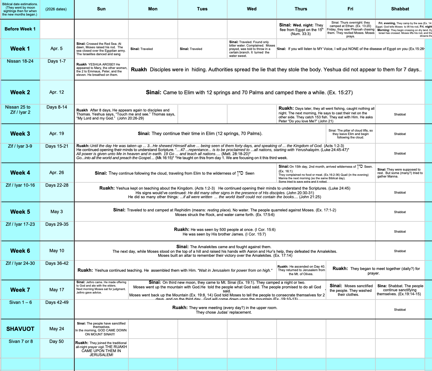 Here's a weekly chart with 2026 dates for Counting each Omer week and day and for keeping track of what was happening in the Exodus and after Yeshua's Resurrection. It also shows each weekly Parsha for 2026. (See it above to zoom in.)