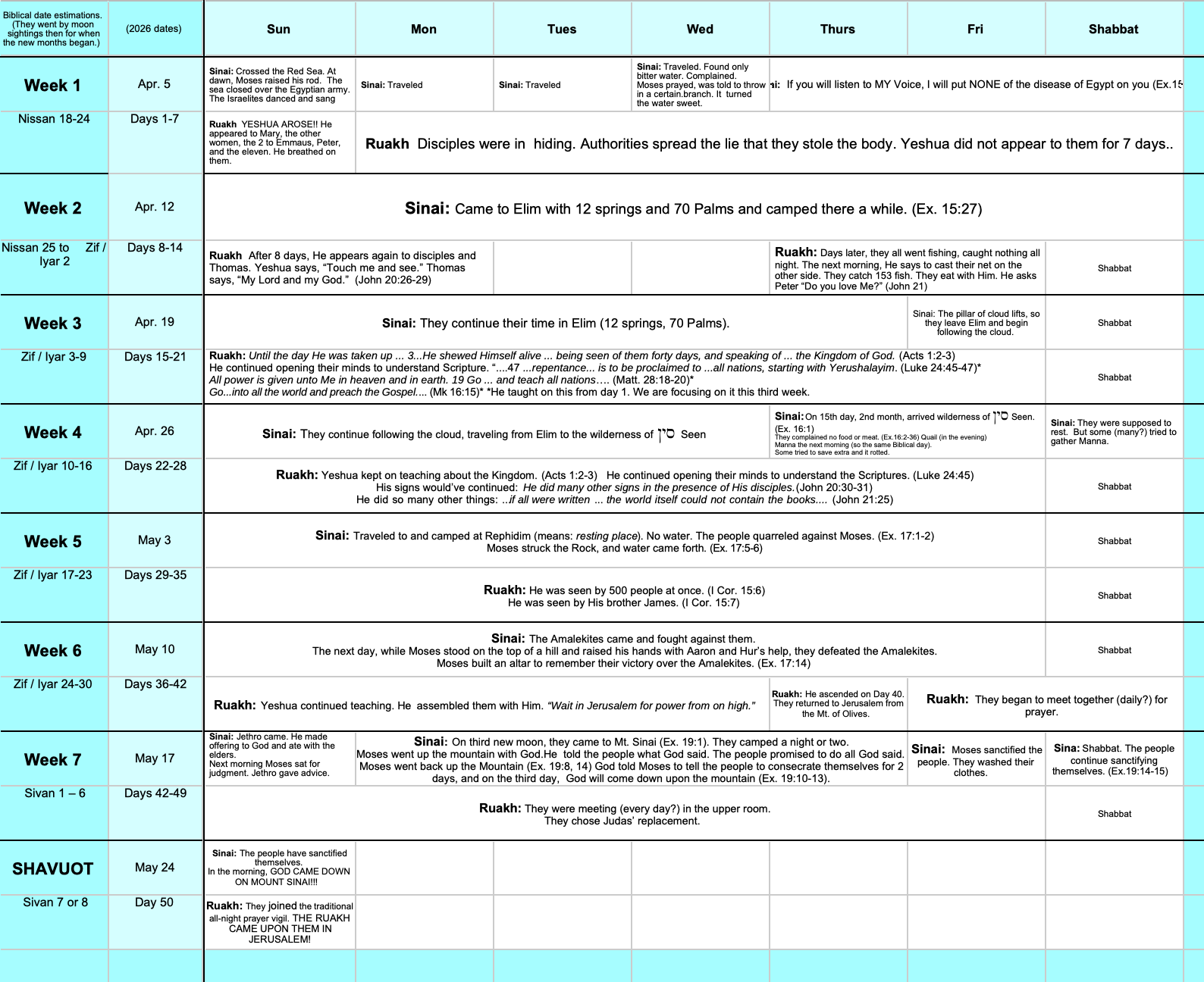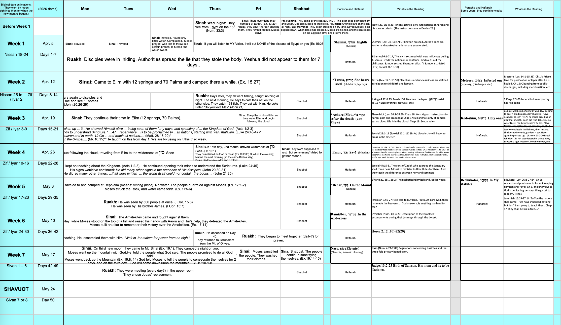Here's a weekly chart with 2026 dates for Counting each Omer week and day and for keeping track of what was happening in the Exodus and after Yeshua's Resurrection. It also shows each weekly Parsha for 2026. (See it above to zoom in.)