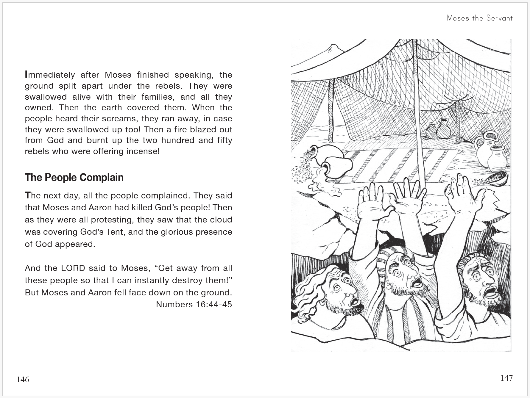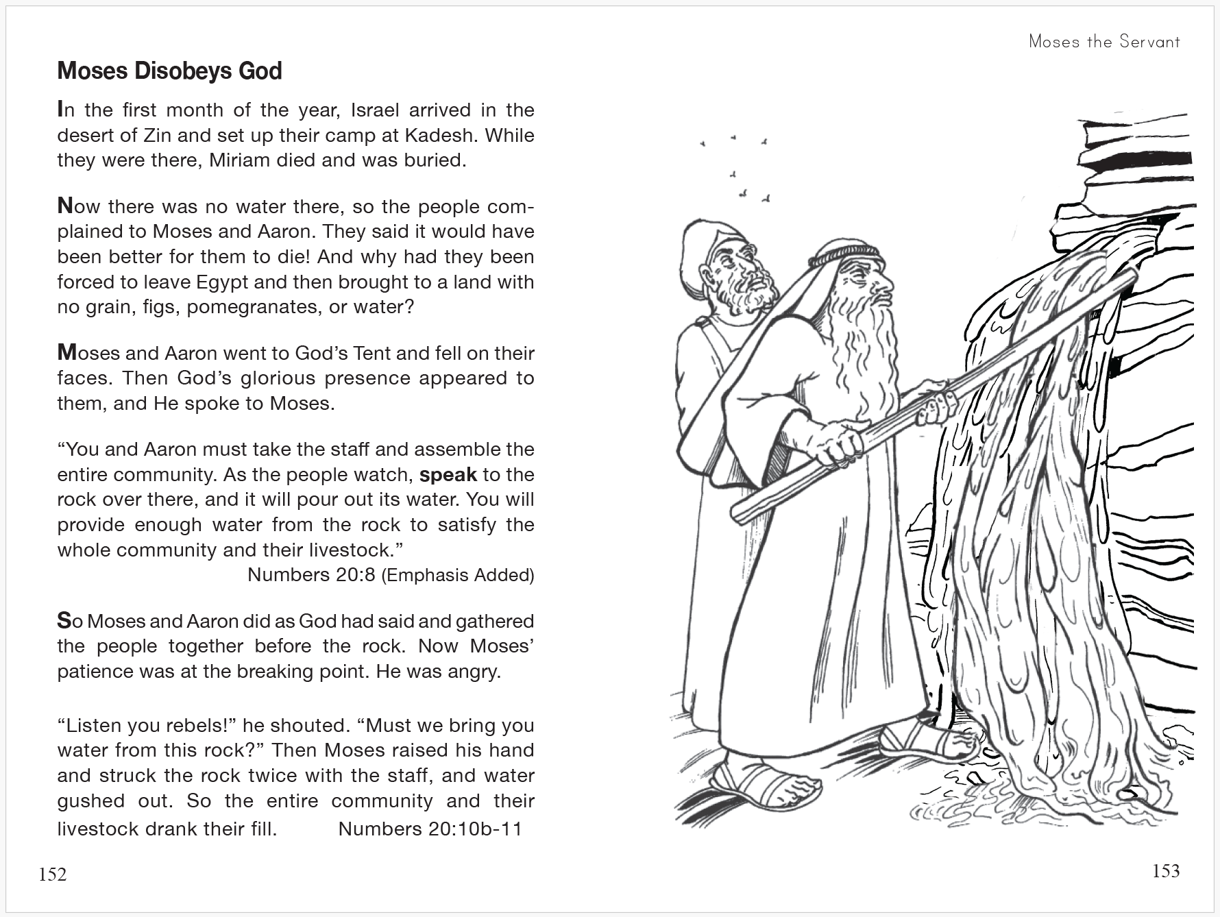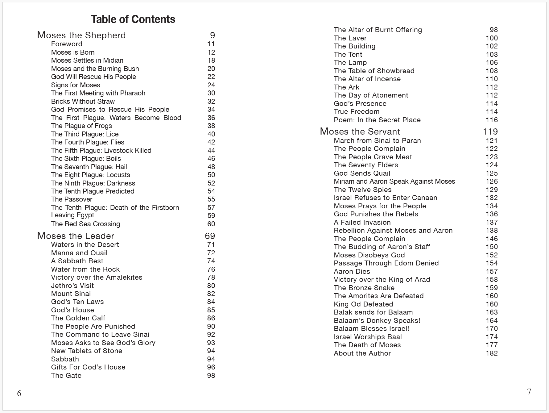 In the Moses, the Servant section, Aaron and Moses face the challenge of leading the complaining and rebellious Israelites on their journey to the Promised Land. This last section gives the story of the twelve spies, of the refusal to enter the Promised Land, of Korah's rebellion and punishment, of Aaron's budding rod, of the battles against kings, of Balaam whose donkey speaks to him, and more, all the way to Moses looking over the Promised Land before his death.