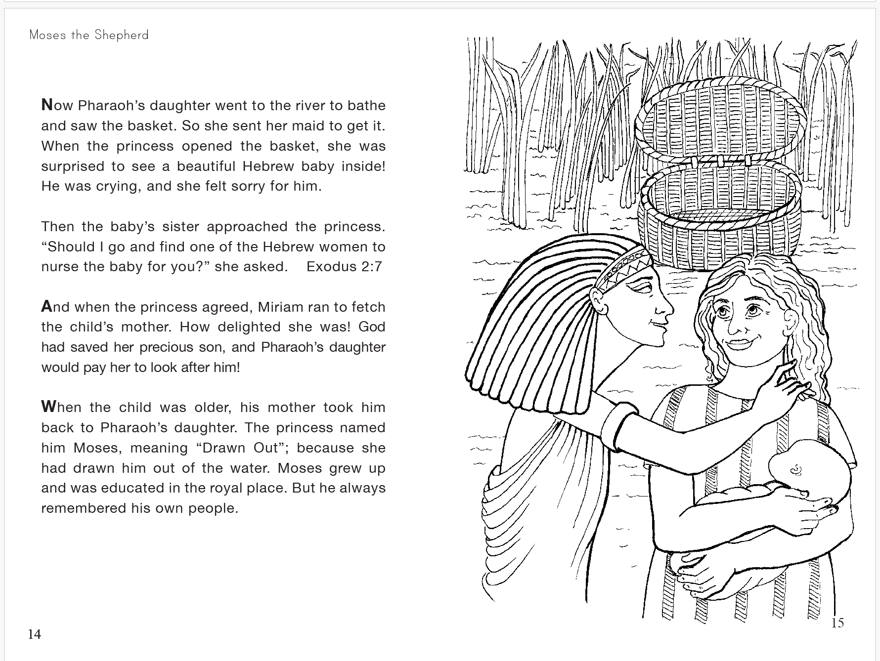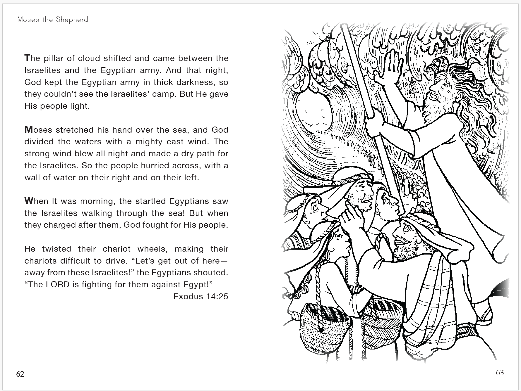 In the Moses, the Shepherd section, children will see that baby Moses was saved in a basket, grew up, risked his life to protect slaves, fled to Midian, saw the burning bush, heard God speak, bravely obeyed God in going to Pharaoh and telling him to let God's people go. Your children will see that God brought ten plagues on Egypt that finally caused Pharaoh to release the Israelites. Then they will see God's miraculous parting of the Red Sea.