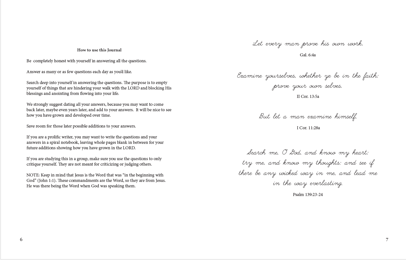 We may think we are obeying these two greatest commandments and also the big TEN, but are we really? Answer the questions in this journal to find out. No condemnation or legalism here. Only soul searching to draw closer to the One who loves us beyond measure and knows what will bring us the greatest blessings in this life and the next and what is blocking those blessings.