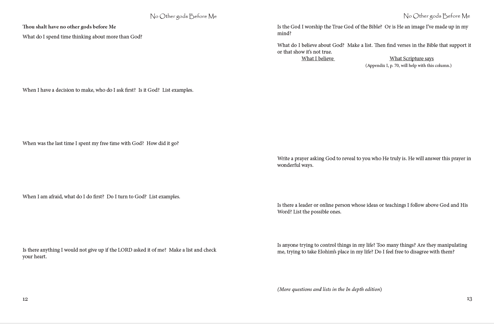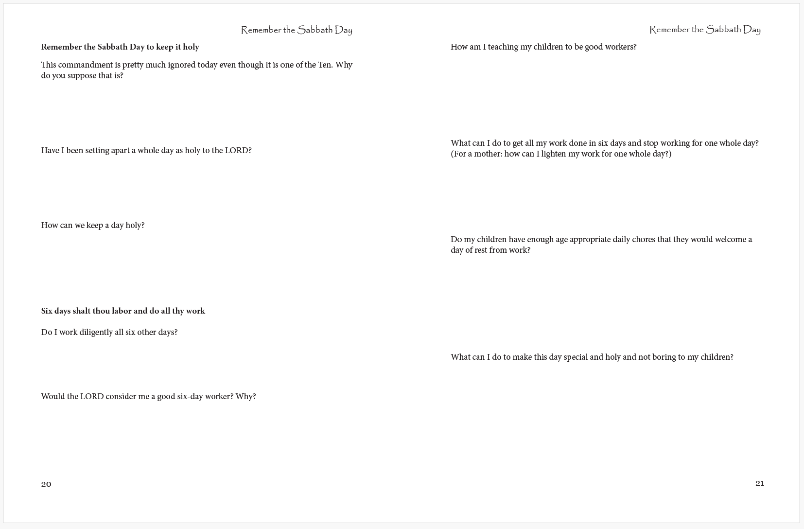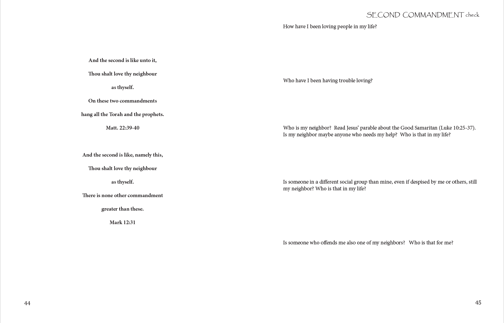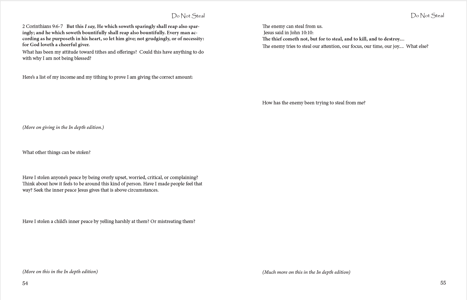Using a gentle, non-judgmental, encouraging approach, this private journal takes the commandments piece by piece and applies them to our personal lives, helping us examine our thoughts and actions and words and attitudes to see how we line up. We are encouraged to write the dates for our entries and come back later to record how we are growing in the Lord. For some of the items, there are extra pages for keeping track.